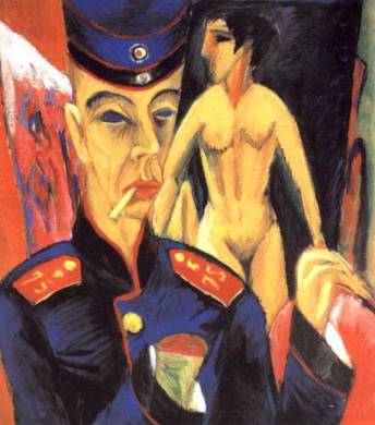 A prima vista il quadro di Kirchner Autoritratto in divisa (fig.13) potrebbe sembrare scostante con le linee di contorno aguzze, la donna sullo sfondo stilizzata e poco attraente, la mano in primo piano contratta e l’altra mozzata, gli occhi senza pupille. Non c’è nulla nella composizione che metta a proprio agio l’osservatore, che lo gratifichi positivamente. Infatti Kirchner dipinse questo quadro dopo essere tornato dalla Prima Guerra Mondiale e il suo intento era dichiarare la sua lacerazione interiore dopo tutti gli orrori che aveva visto: si dipinge perciò disinteressato all’amore, simboleggiato dalla donna alle sue spalle, e privato degli occhi e della mano destra, indispensabili per un pittore. Se la composizione avesse presentato forme più piacevoli, realizzate con una tecnica più curata, l’impatto emotivo sarebbe stato sminuito.
