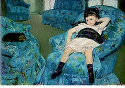 Bambina su una poltrona blu (fig.5) di Mary Cassatt invece ci evoca il silenzio e la fresca penombra del salotto fanno da sfondo al riposo scomposto della bambina e, sull’altra poltrona, del cagnolino, facendoci intuire che avevano giocato, probabilmente in modo piuttosto agitato, fino ad un attimo prima. In entrambi i quadri le immagini sono realizzate attraverso pennellate veloci, che non riproducono i dettagli, ma danno l’idea di qualcosa di fuggevole, di un soggetto che era diverso un istante prima e sarà differente un istante dopo. Come Raffaello e Dalì questi artisti hanno usato la tecnica a olio, ma il colore è steso con brevi pennellate che viste da vicino sembrano casuali, ma nell’insieme colgono in modo sorprendente la variabilità delle situazioni e della luce.