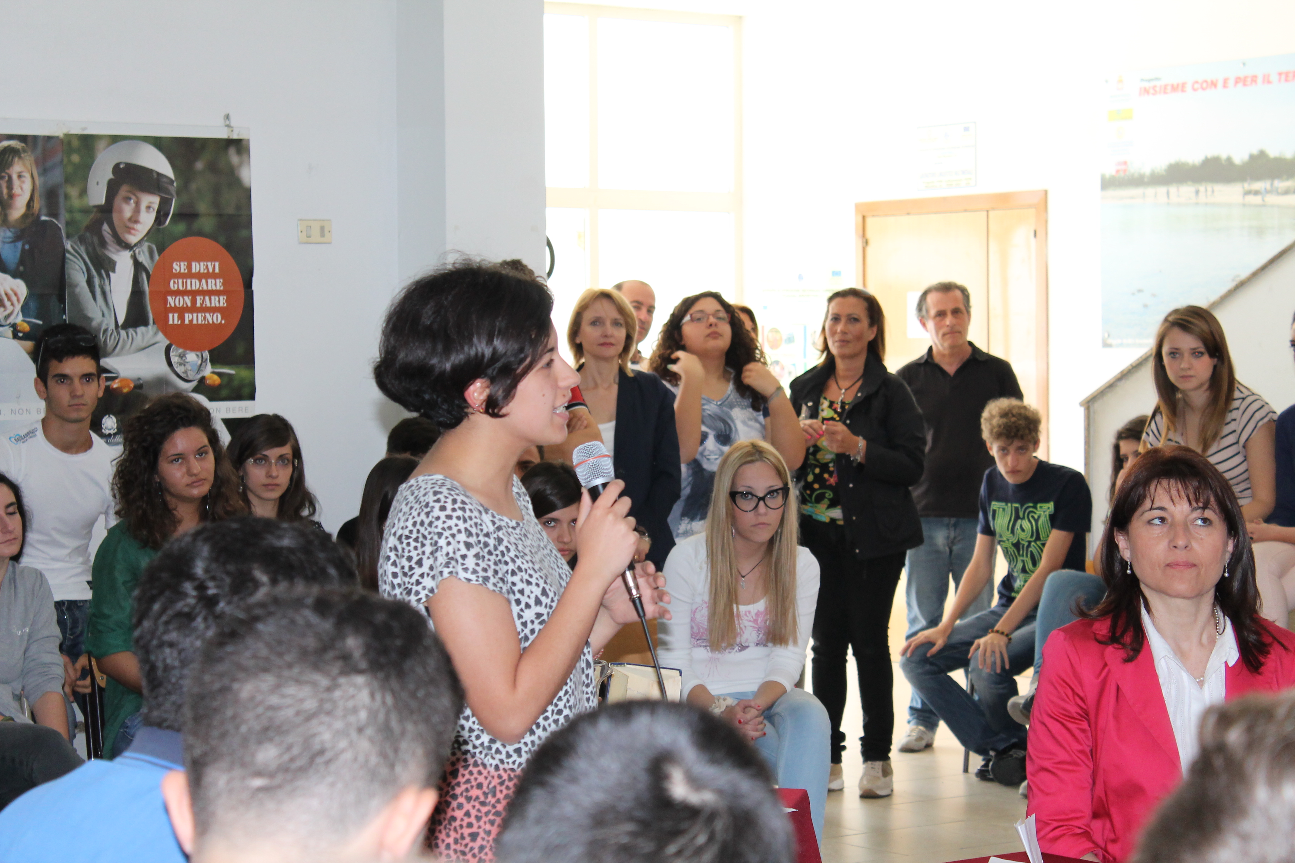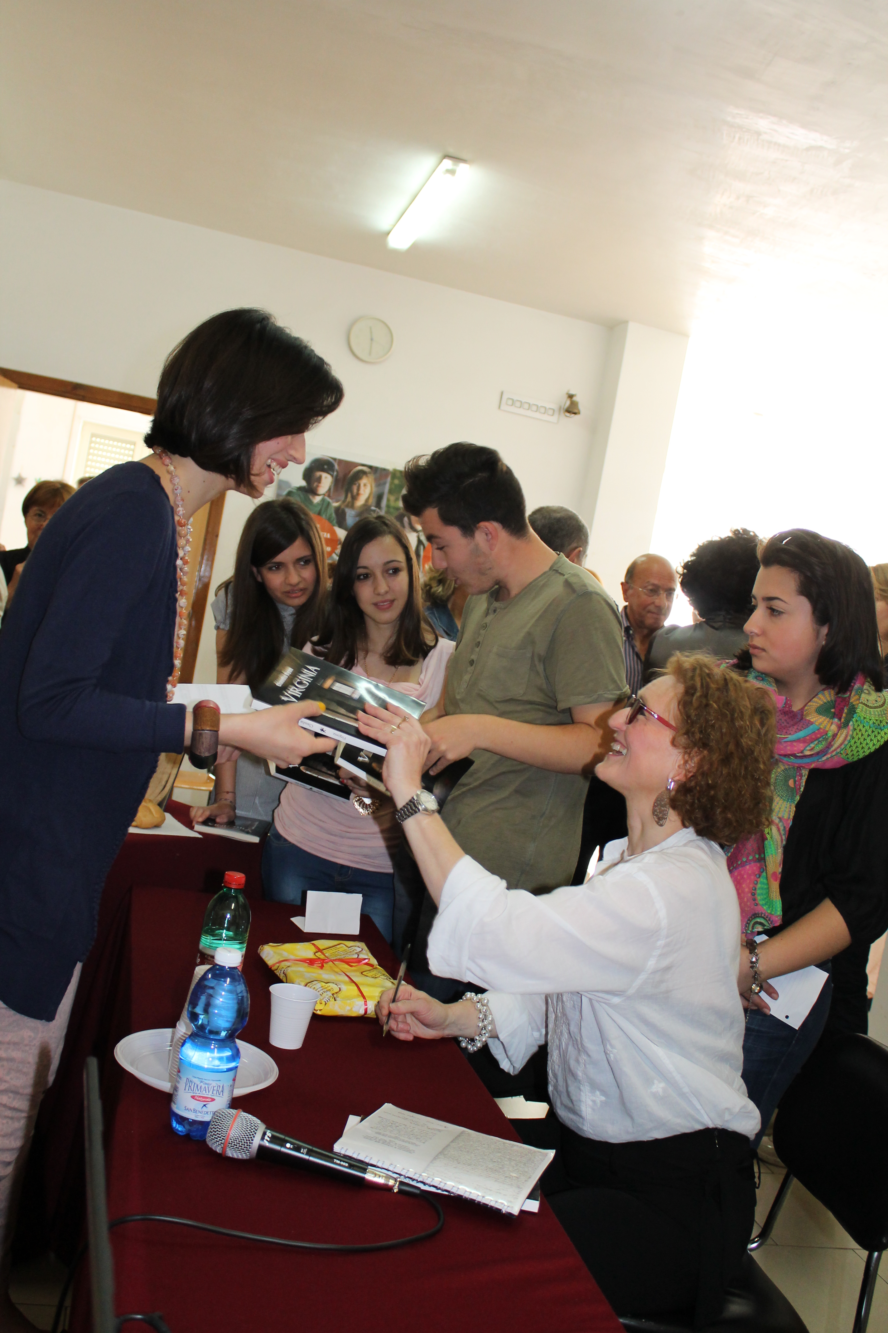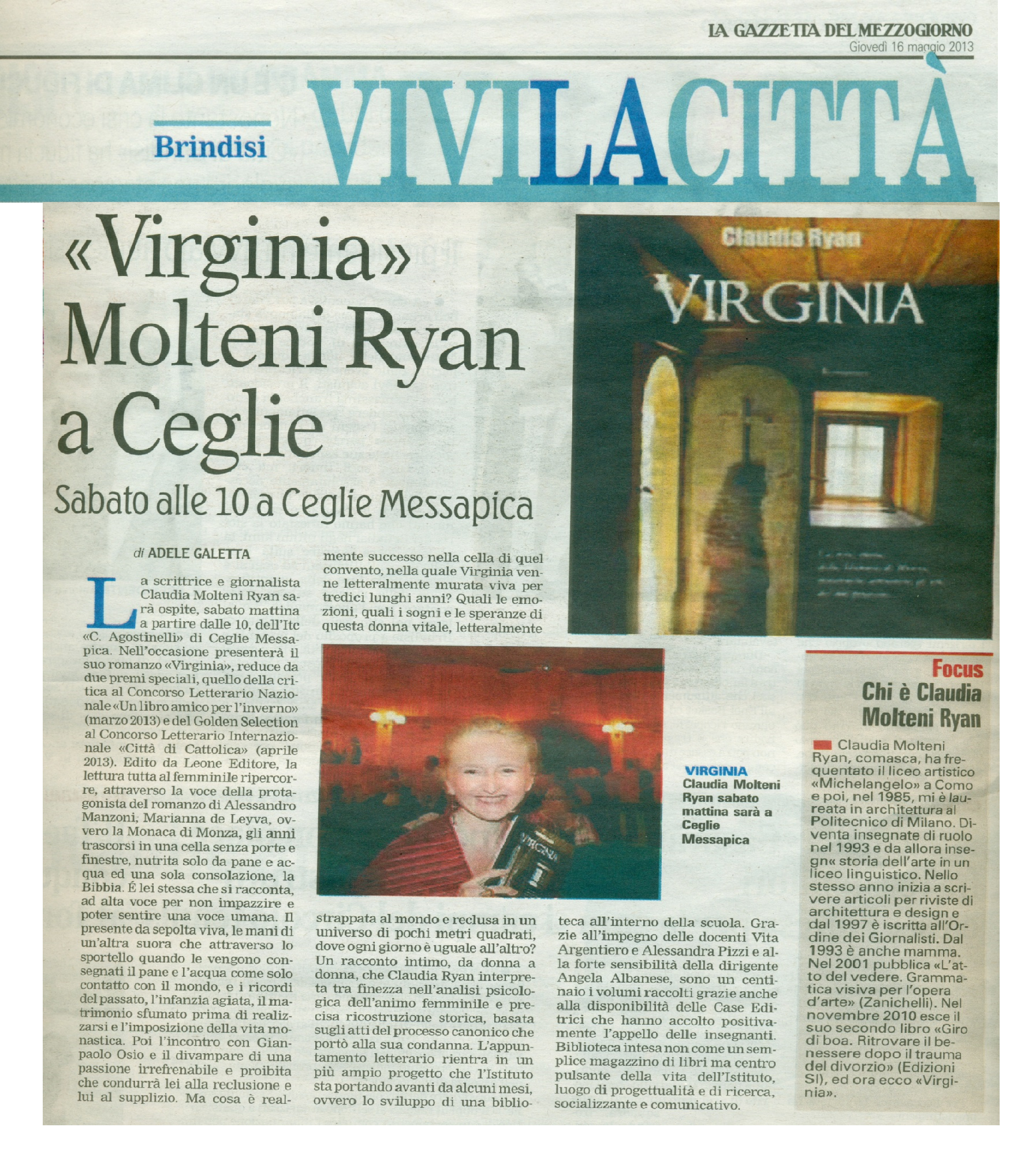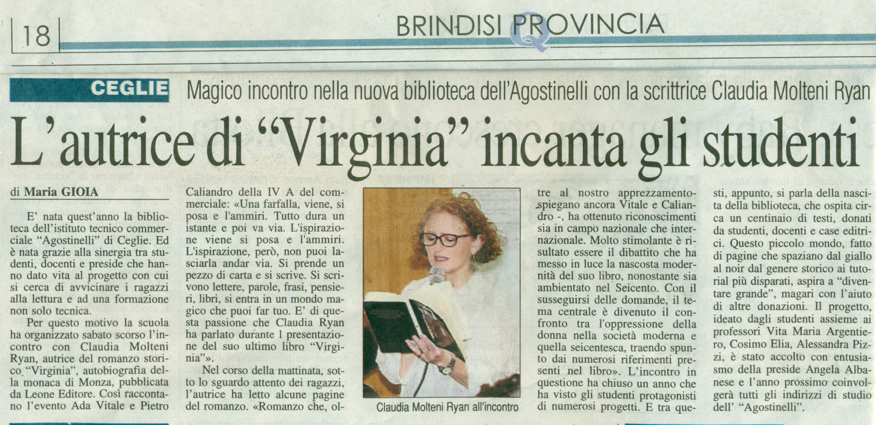 Alle ore 10 di sabato 18 maggio 2013 gli studenti dell’Istituto Agostinelli si sono riuniti nell’atrio della loro scuola (purtroppo l’edificio non ha un’aula magna) ed hanno accolto con calore e interesse l’autrice Claudia Ryan. Molti degli studenti avevano già letto il romanzo “Virginia” e lo avevano commentato con gli insegnanti in classe. Dopo l’introduzione della professoressa Vita Maria Argentiero, organizzatrice dell’evento, e della preside dell’Istituto, tre studentesse hanno presentato ai compagni i tre elementi con cui Virginia ha convissuto per quattordici anni nella sua cella: dell’acqua, del pane e una Bibbia.