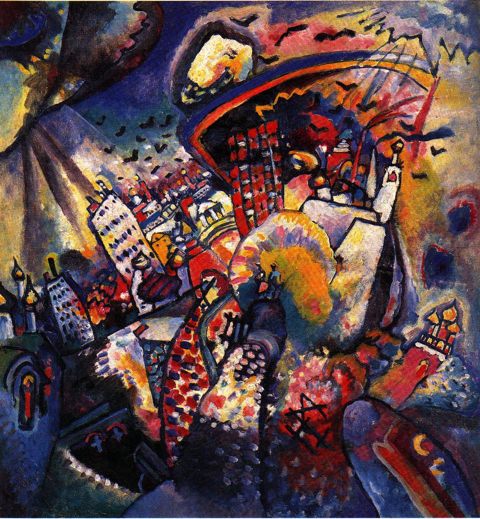 Kandinsky preferisce le evanescenze cromatiche dell’acquarello, che imita con la pittura a olio, e i colori li esalta accostandoli al nero. Per lui ogni colore ha un proprio significato espressivo (“Lo Spirituale dell’arte, 1909) e la forma diventa autorefenziale nelle sue Composizioni, Impressioni e Improvvisazioni, arrivando così all’astrattismo. Quando il soggetto permane, come in Mosca I, i colori e la semplificazione formale evidenziano sempre aspetti lirici di una realtà fantasmagorica.