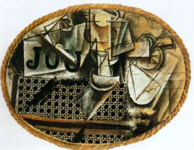 “Natura morta con sedia impagliata” (1912) di Pablo Picasso segna il momento di passaggio dal Cubismo analitico a quello sintetico. Infatti la natura morta (un giornale, una pipa, un bicchiere, un coltello con una fetta d’arancia, un piatto e dei fogli) è raffigurata con la concezione tipica del periodo analitico (1909-1912): i soggetti sono visti contemporaneamente da più punti di vista (ad esempio il bicchiere è visto di fianco, la sua base dall’alto), la loro immagine reale è stata scomposta in piani, poi ricomposti sulla tela, sovrapponendosi e compenetrandosi, creando così una nuova visione intellettuale della realtà. La sedia è invece già sintomo di cambiamento: è rappresentata attraverso i suoi due elementi che la caratterizzano e la rendono riconoscibile, cioè la paglia di Vienna e la rotondità della seduta. I colori sono ancora quelli tipici del cubismo analitico, una gamma ridotta ai marroni, ocra, bianco e nero. Una curiosità: Picasso non si separò mai da questo quadro.