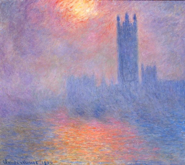 La nebbia si dirada, un raggio di sole fa capolino e va a riflettersi sulle calme acque del Tamigi, ma va anche a saturare le particelle d’acqua sospese nell’aria, facendo così risaltare in controluce la sagoma violetta del Parlamento. Un quadro, questo di Monet, che è pura poesia, dove tutto è vibrante e mutevole grazie alle piccole pennellate di colore puro, accostate, sovrapposte, con andamenti diversi a seconda dei soggetti. E’ un tipico quadro impressionista dipinto en-plain-air, dove Monet cerca di fissare sulla tela la mutevolezza della realtà, come fece anche nel soggetto simile “Impression soleil levant”.