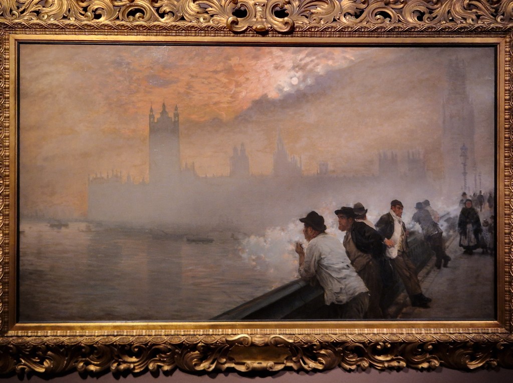 La giornata sta terminando, il sole è sempre più basso all’orizzonte ed è velato da uno strato di nubi che s’intridono di arancio e violetto. In controluce appare la sagoma inconfondibile del Parlamento di Londra, quasi una visione, apparentemente impalpabile, ma che in realtà riflette la sua mole sulle acque del Tamigi. Comunica un senso di pace, di ritmi rallentati, anche grazie alle barche che stazionano sulle placide acque del fiume. In primo piano il ponte di Westminster è visto di scorcio: è la parte vitale del quadro, che con il suo dinamismo si contrappone, ma nello stesso tempo si integra, a quella precedente. I lavoratori si appoggiano al parapetto del ponte, chiacchierano, fumano, si rilassano dopo una dura giornata di lavoro. Una donna viene verso di noi con due bambini. Sono tutti di una classe sociale proletaria, mentre sul fondo si intravvede un uomo col cilindro che si allontana. Le pennellate sono fluide, veloci, ma attente ai dettagli in primo piano e alle variazioni cromatiche. Giuseppe de Nittis rappresenta in questo quadro una veduta suggestiva del Parlamento di Londra, ma ben diversa da quella del suo collega Monet, interessato esclusivamente alla mutevolezza di luce e colore. Qui si coglie l’atmosfera di un momento non solo legato alla meraviglia del luogo e del tramonto, ma anche allo stato d’animo delle persone.