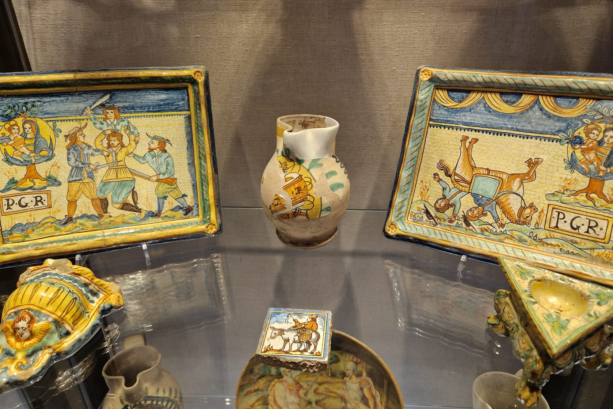 Each object, each work on display has its own charm, and one understands why it was chosen, why it was bought. Sometimes they are small objects of ancient art, which become even more interesting because they are in dialogue with other small objects of the same type, displayed in the same showcase. In other cases we are confronted with important pieces, such as the glazed ceramic bust of Christ by Giovanni Della Robbia (son of the more famous Andrea della Robbia) or the beautiful embossed helmet. But there are many more works to mention. For now, we will focus on two smaller works, but of delicate popular beauty: two ex voto in glazed ceramic.