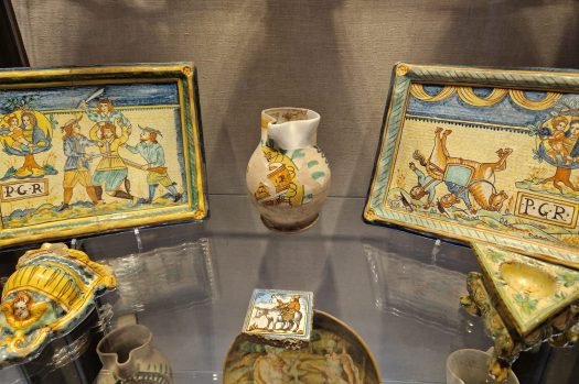 Ogni oggetto, ogni opera esposta ha un suo fascino, si capisce perchè è stata scelta, comprata. A volte sono piccoli oggetti d’arte antica che diventano ancora più interessanti perchè dialogano con altri piccoli oggetti dello stesso tipo, esposti nella stessa vetrina. In altri casi ci troviamo davanti a pezzi importanti, come il busto di Cristo in ceramica invetriata di Giovanni Della Robbia (figlio del più famoso Andrea della Robbia) o del bellissimo elmo lavorato a sbalzo. Ma le opere da citare sarebbero molte di più. Qui, ora, ci dedichiamo a due manufatti minori, ma di delicata bellezza popolare: due ex voto in ceramica smaltata.