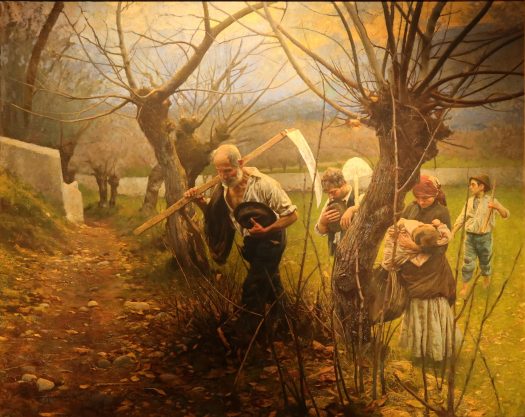 Il primo dipinto che vi presento è di Arnaldo Ferraguti, “Vespro” (1895). Esponente del verismo sociale, qui rappresenta una famiglia, stanca, mentre torna a casa dopo una giornata di lavoro nei campi. Sono presenti tutte le età: il padre, capofamiglia, ancora tonico malgrado l’età, lo seguono due giovani, probabilmente sposati, e lei tiene in braccio un bambino, e infine un ragazzino. Ognuno di loro ha in mano uno strumento di lavoro. I due uomini si sono tolti il cappello, lo tengono in mano e abbassano la testa, in segno di rispetto: il titolo dell’opera, Vespro, ci porta a pensare che le campane stiano rintoccando richiamando alla preghiera. La scena, ambientata in campagna, in autunno, è unificata da una bella e calda luce, tipica del tramonto, che stempera la durezza della fatica a fine lavoro.