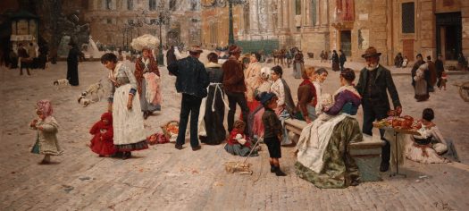 “Porta capuana” (1906 ca) di Vincenzo Migliaro è uno sfolgorio di luce, movimento e colori. Il mercato del pesce a Napoli è rappresentato in tutta la sua chiassosità, ma sullo sfondo sono presenti le mura di Castel Capuano (come era all’inizio del Novecento), che contrasta per stabilità e forza. La meraviglia è la luce del mattino, il sole che, alzandosi in cielo, abbaglia con la sua calda luminosità attraverso l’arco della Porta.