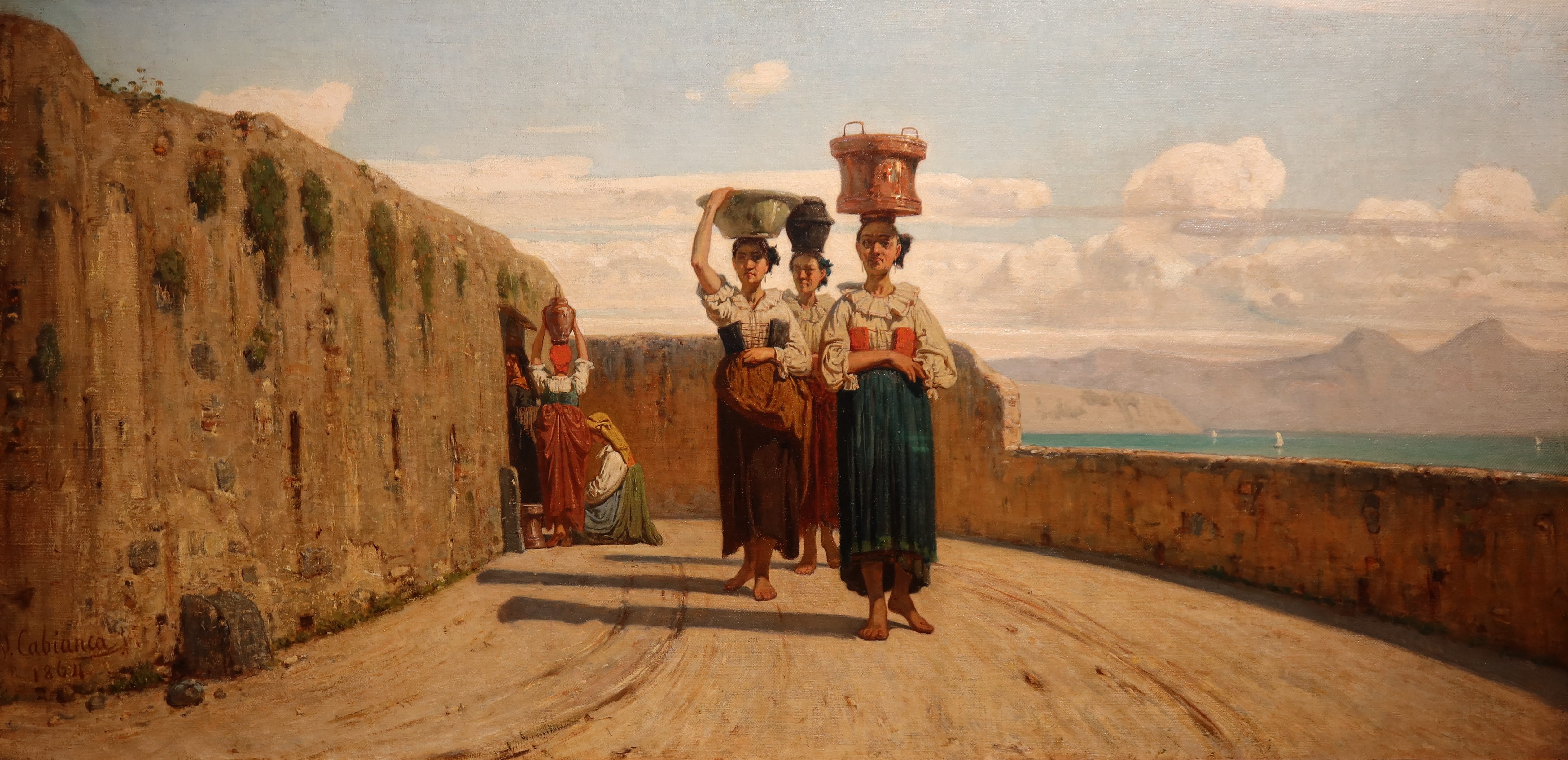 In “Acquaiole a La Spezia” (1864) di Vincenzo Cabianca sono rappresentate tre donne che avanzano verso di noi tenendo dei contenitori pieni d’acqua sulla testa. È un incedere lento e la loro posizione retta gli dona un atteggiamento statuario. Dietro di loro altre tre donne attendono di entrare nella cavità dove sgorga l’acqua. Cabianca rappresenta le tre acquaiole con solennità grazie alla loro posizione centrale in un taglio compositivo lungo e stretto, solennità che sottolinea la loro dignità, anche se svolgono un lavoro umile che, però, è fondamentale, perché acqua è vita. Il loro ruolo di lavoratrici che non riusciranno a smarcarsi dalla fatica quotidiana, è simboleggiato dai muri che delimitano la via, intesi in questo caso come limiti alla loro vita. Sullo sfondo il golfo di La Spezia, di un bellissimo turchese, e delle vele spiegate al vento, a indicare il contrasto tra la dura e obbligata vita del lavoro e il senso di libertà.