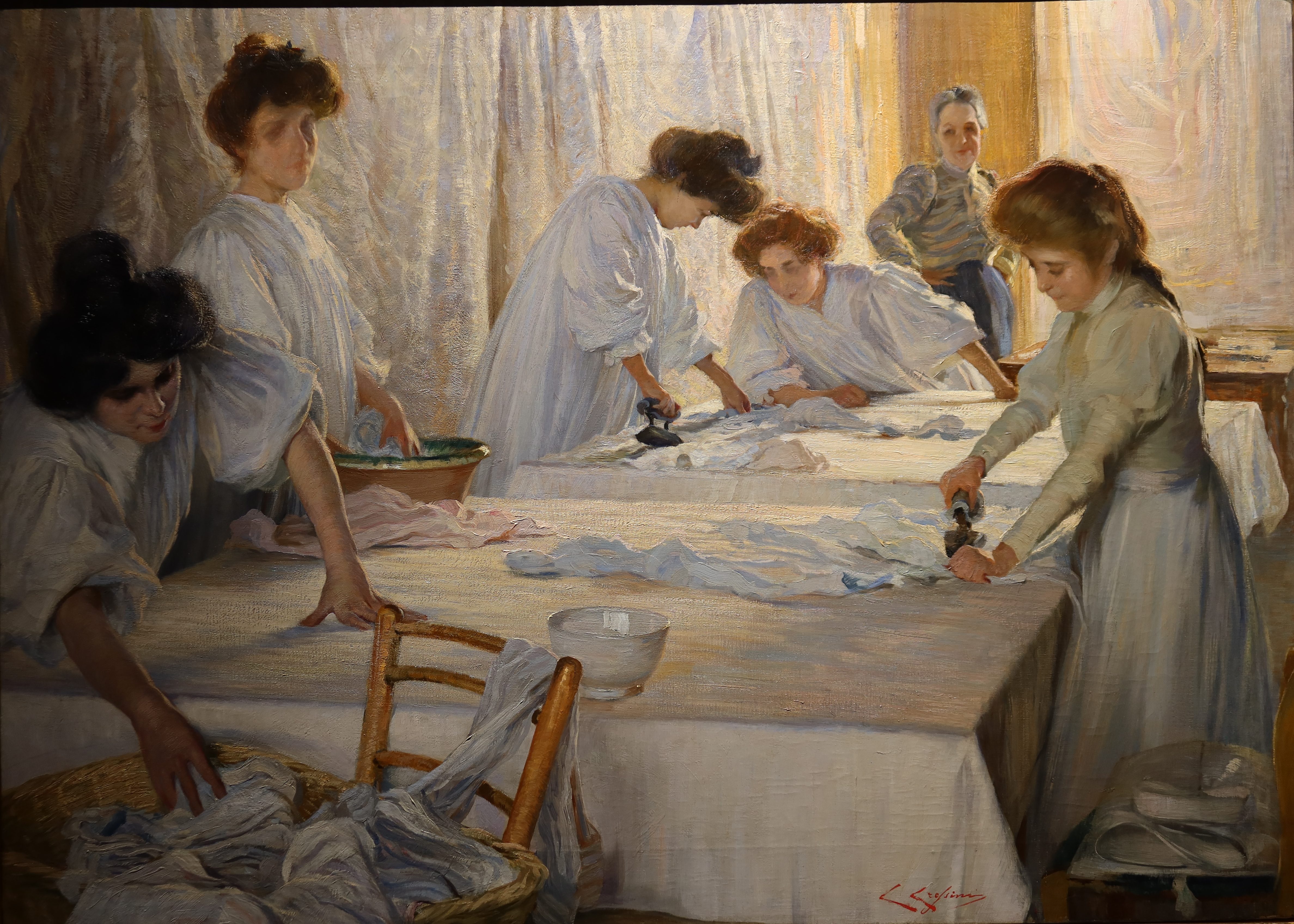 Ultimo quadro che vi presento è di Carlo Cressini, “Le stiratrici” (1905-06 ca). Una bellissima luce, rappresentata con una tecnica tutta impressionista, caratterizza questo dipinto. Una luce primaverile entra dalle finestre di fronte a noi, gioca con il biancore delle tovaglie, dei vestiti, delle tende; mette in risalto i due ferri da stiro neri, la bacinella in ceramica, e poi i gesti e le espressioni delle stiratrici, che lavorano sotto lo sguardo vigile della padrona, posta sul fondo con le braccia sui fianchi.